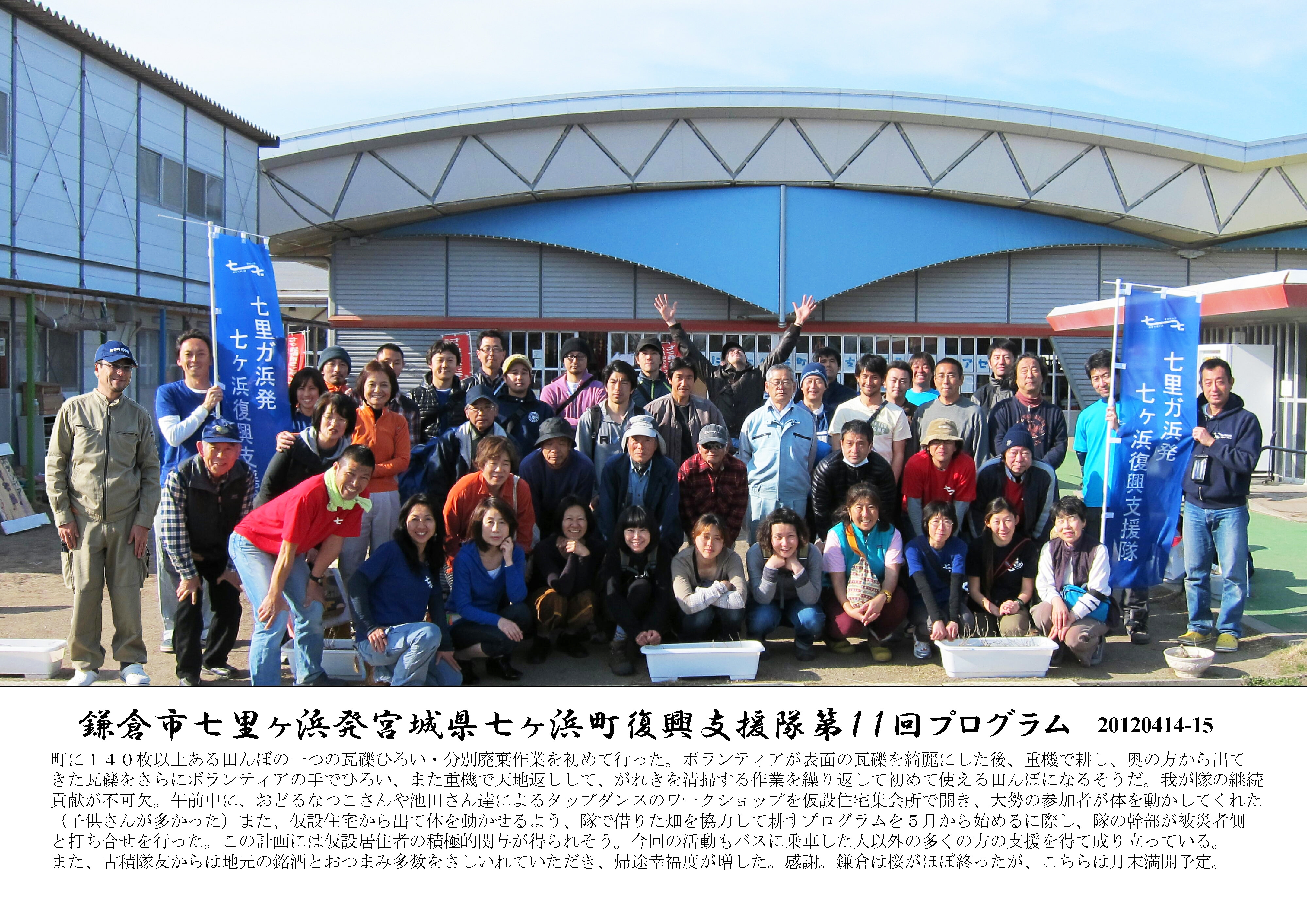 第11回目の七里ガ浜発七ヶ浜復興支援隊ボランティアバスは総勢45名の参加者のもと無事に終了しました。今回の活動は津波が押し寄せた田んぼのがれき撤去。そして、5月より本格始動する仮設住宅内での菜園作りの説明会&意見交換会とTAPチームによるワークショップでした。
